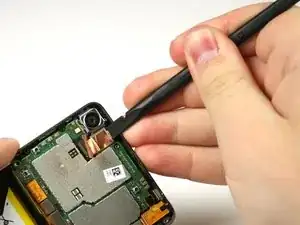 Используйте плоский край нейлоновой лопатки, чтобы поднять камеру и извлечь её из телефона.