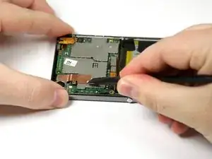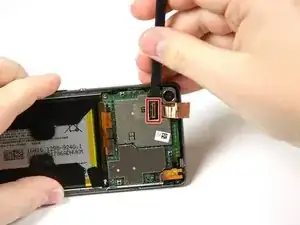 Используйте плоский край лопатки, чтобы отогнуть медную шлейфовую перемычку справа от задней камеры.