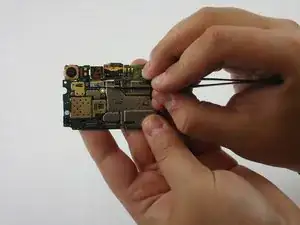 Передняя камера подключена к материнской плате через шлейф; используйте пинцет, чтобы отсоединить её от платы.