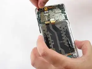 Используйте пинцет, чтобы отсоединить маленький шлейф на левой стороне рядом с кнопками регулировки громкости, поддев его вверх.