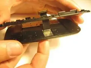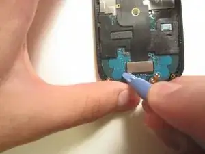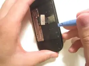 Поверните телефон на 180 градусов и используйте пластиковую отвертку, чтобы поднять металлическую пластину, закрывающую ленточный кабель.