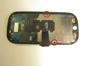 Поверните телефон на 180 градусов и отверткой с подходящей насадкой выкрутите два винта диаметром 3 мм, которые крепят материнскую плату к передней крышке. Отложите винты в сторону.