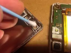 Удалите весь старый двухсторонний скотч и остатки стекла. Нанесите новый слой двухстороннего скотча на раму, не закрывая отверстия для фронтальной камеры и датчика приближения.
