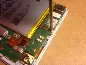Аккумулятор прикреплён двумя небольшими кусочками двухстороннего скотча. Аккуратно подденьте его снизу — аккумулятор должен легко сняться.