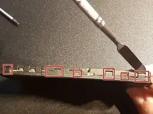 Чтобы снять клавиатуру, воспользуйтесь лопаткой, чтобы слегка отжать верхние защёлки, одновременно нажимая пальцами изнутри клавиатуры.
