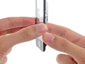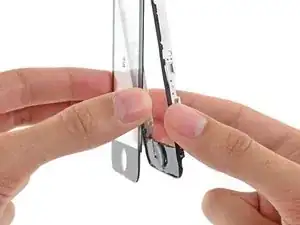 Между серебристой передней рамкой и чёрным блоком дисплея находится резиновая прокладка. В этом шаге потребуется небольшое усилие, чтобы отделить блок дисплея iPhone.