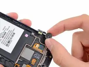 С помощью кончика лопатки подденьте вибромотор и извлеките его из его гнезда в узле передней панели.