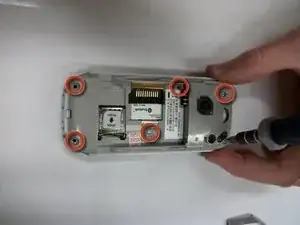 Используя отвертку T5 или T6, выкрутите шесть винтов с задней части телефона, как показано на первом изображении.