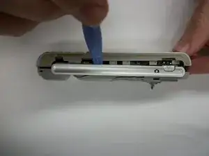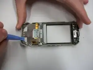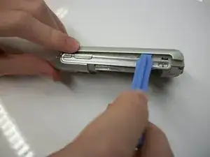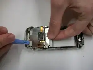 Снимите заднюю половину телефона, используя пластиковый инструмент для вскрытия, чтобы разъединить верхнюю и нижнюю половины. Вставьте инструмент по краю телефона, чтобы вывести защёлки из зацепления.