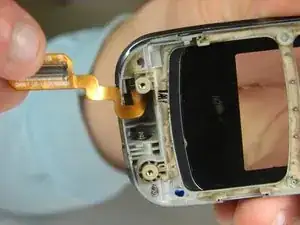 Шлейф дисплея всё ещё будет прикреплён к телефону через шарнир. Отсоединение шлейфа дисплея на этом шаге необходимо для отделения экрана от узла экрана.