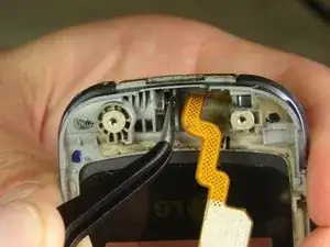С помощью пинцета вытяните серый пластиковый элемент, который проходит вокруг гибкого кабеля, из области шарнира.