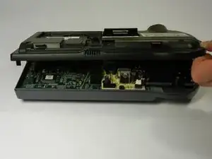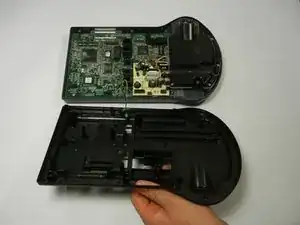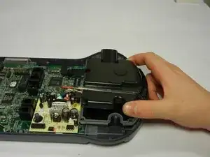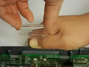 Оттяните серый пластиковый корпус от платы цепи и одновременно снимите прозрачную изогнутую пластиковую деталь, потянув её прямо вверх.