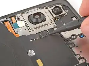 Используйте острие лопатки, чтобы поддеть и отсоединить пресс‑коннекторы антенны 5G mmWave и передней камеры.