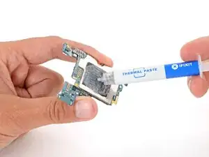 Осторожно нанесите небольшую полоску теплопроводящей пасты (примерно размером с зернышко риса) в центр чёрной пленки на нижней части логической платы.