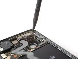 Используйте лопатку, чтобы поддеть и отсоединить пресс‑разъём ультраширокоугольной задней камеры от платы.