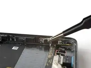 Вставьте наконечник лопатки под верхний левый угол защёлки разъёма экрана.