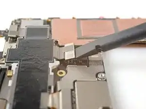 Наклоните плату вверх, одновременно аккуратно потянув её в сторону правого края телефона, чтобы освободить нижнюю защёлку.