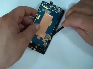 Поднимите вибромотор и извлеките все гибкие шлейфы, кроме гибкого шлейфа ЖК-дисплея.