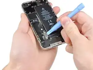 Кромкой пластиковой открывалки аккуратно подденьте разъём аккумулятора, чтобы отсоединить его от разъёма на плате логики.