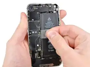 Подтяните вверх за прозрачную пластиковую ленту, чтобы отделить аккумулятор от клея, которым он приклеен к корпусу iPhone.