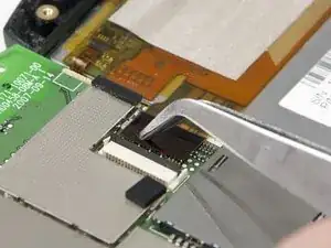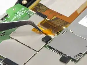 С помощью пинцета поднимите чёрную пластиковую защёлку, закрывающую ленточный кабель, подключённый к экрану.