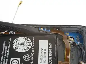 Используйте острый конец лопатки, чтобы отсоединить белый антенный кабель справа от батареи.