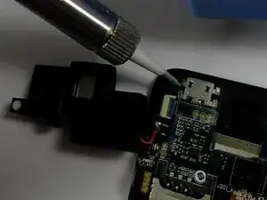 С использованием паяльника и пары плоскогубцев расплавьте четыре припойных соединения вокруг зарядного порта.