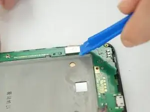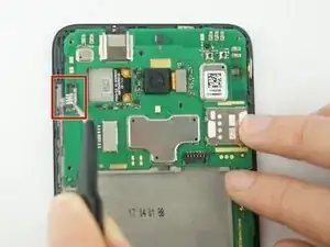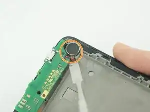 С помощью металлической лопатки аккуратно снимите динамик, приклеенный в левом нижнем углу телефона.