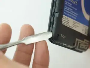Подденьте заднюю крышку металлической лопаткой или ногтем в выемке в левом нижнем углу телефона.