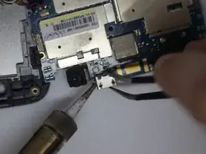 Используя пинцет и паяльник, распаяйте порт зарядки во всех четырёх точках пайки на каждом углу порта.