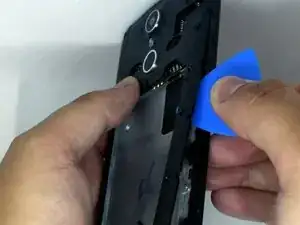 Используя медиатор для вскрытия, начните поддевать один из верхних углов, чтобы снять среднюю рамку с устройства.