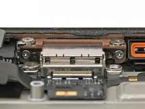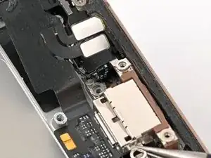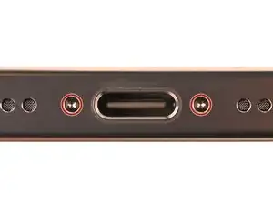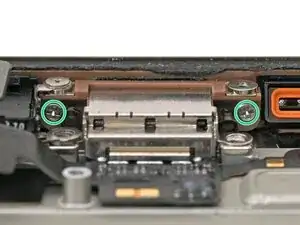 Используйте отвертку P2 pentalobe, чтобы вынуть два винта длиной 7.4 мм по обе стороны от USB‑C порта.