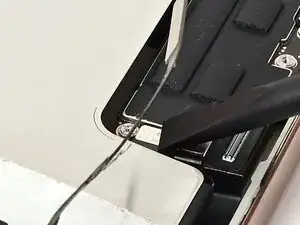 Проведите вторым медиатором вокруг нижнего левого угла и вдоль левого края экрана, чтобы отделить клей и освободить металлические защёлки.