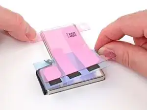 Аккуратно совместите открытую кромку клеевой ленты с соответствующей кромкой рамки iPhone.