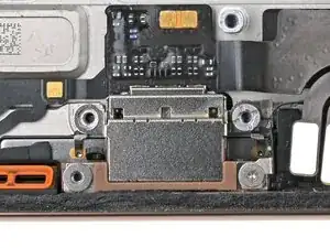 Используйте iOpener или фен, чтобы нагреть участок нижнего кабеля сборки над Taptic Engine до ощутимой на ощупь температуры.
