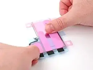 Совместите прокладку аккумулятора так, чтобы она была вровень с левой кромкой и нижней стороной нового громкоговорителя. Прижмите её к громкоговорителю, чтобы зафиксировать.