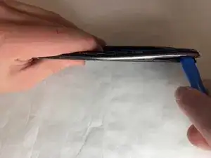 С помощью пластикового инструмента для вскрытия подденьте между экраном и наружной хромированной кромкой, чтобы снять нижний щит с остальной части телефона.