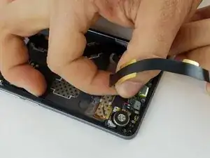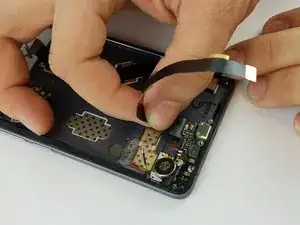 Оттяните ленточный кабель, как показано на изображении. Он соединён как с зарядным разъёмом, так и с вибромодулем (похожим на небольшую батарейку для часов).