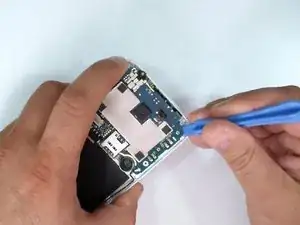 В верхнем левом углу плата зафиксирована пластиковой защёлкой. Используйте пластиковый инструмент и начните разделение отсюда.