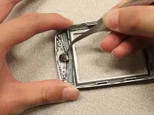 Открутите два винта 3 мм Phillips #0 в нижней части устройства, которые крепят жёсткую гибкую плату к панели экрана.