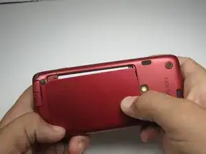 Удерживая кнопку нажатой, приложите лёгкое давление и сдвиньте заднюю крышку.