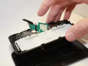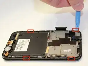 Используйте пластиковый инструмент для открывания, чтобы отсоединить две защёлки, соединяющие материнскую плату с основанием телефона.
