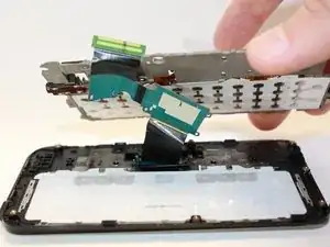 Чтобы извлечь присоединённый гибкий кабель, аккуратно отлепите гибкий кабель, соединённый с задней панелью.