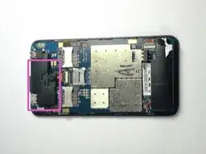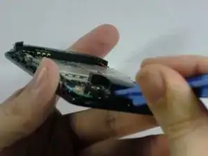 Используйте пластиковый инструмент для открытия или ваш ноготь, чтобы извлечь аккумулятор из правого верхнего угла.