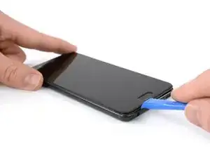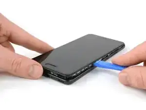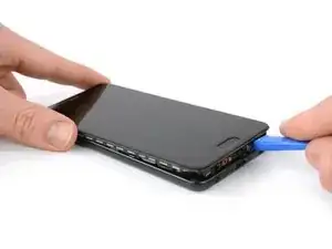 Вставьте пластиковый инструмент для открытия между дисплеем и корпусом, начиная с нижней части вашего телефона.