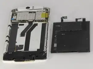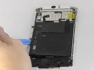 Используйте синий инструмент для вскрытия, чтобы осторожно отделить батарею от склеивающей ленты, которая удерживает ее на устройстве.