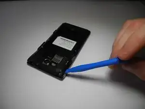 Используйте ноготь или инструмент для подъема, чтобы открыть заднюю крышку телефона, используя вырез внизу.