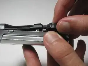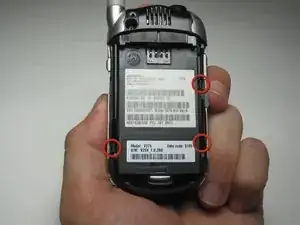 Нажмите на серебристую кнопку одной рукой и сдвиньте заднюю крышку телефона в стороне от антенны.