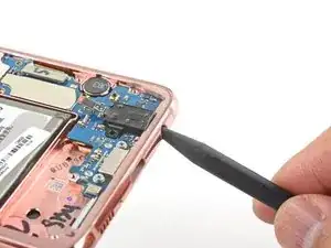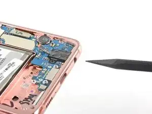 Вставьте острый конец лопатки в небольшой вырез на правом краю пластиковой части верхней средней рамки рядом с кнопкой Bixby.