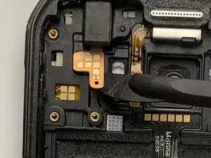 После снятия стекла будет видна небольшая защелка, закрывающая соединение экрана с материнской платой в верхней части телефона. Используйте пинцет, чтобы взять защелку за изгиб на ее боковой стороне и вытянуть ее.